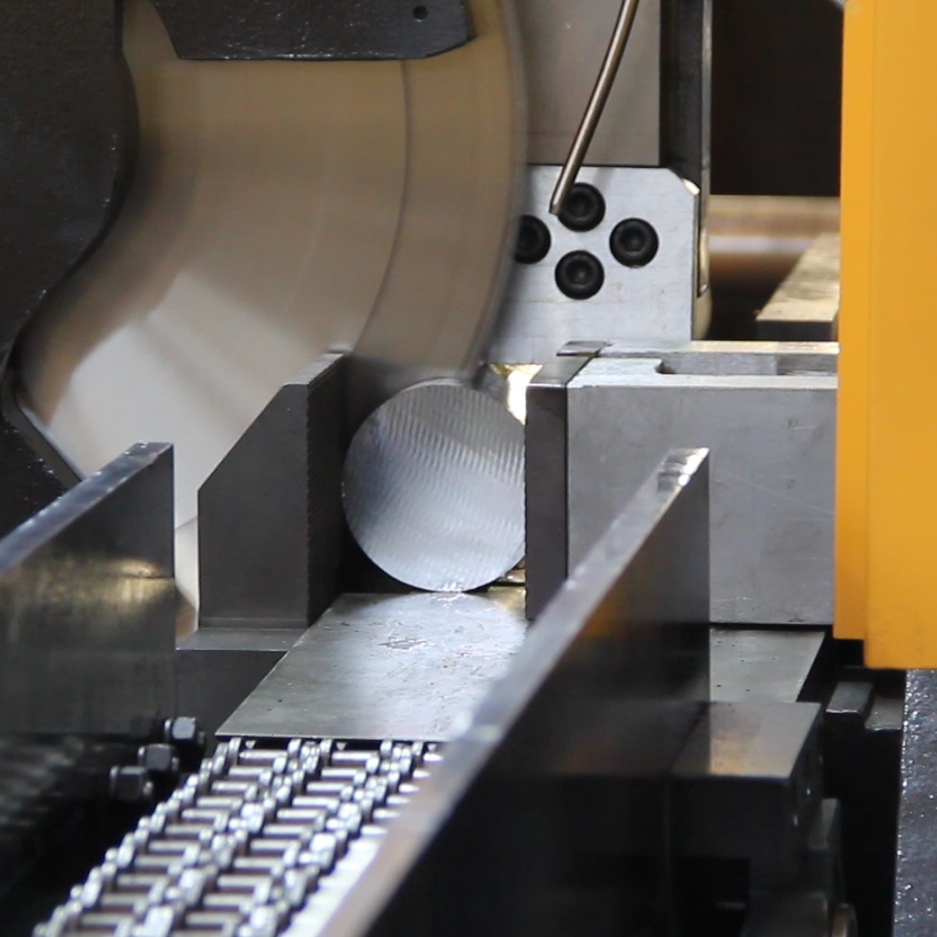 操作人员通过起重机装载多根材料放置储料架上,平放于上料台支撑上,再通过拨料装置将材料移动到前端输送架上,然后将材料依次通过举料系统送至送料辊道上,通过锯切主机设置的定尺尺寸进行锯切成品料。